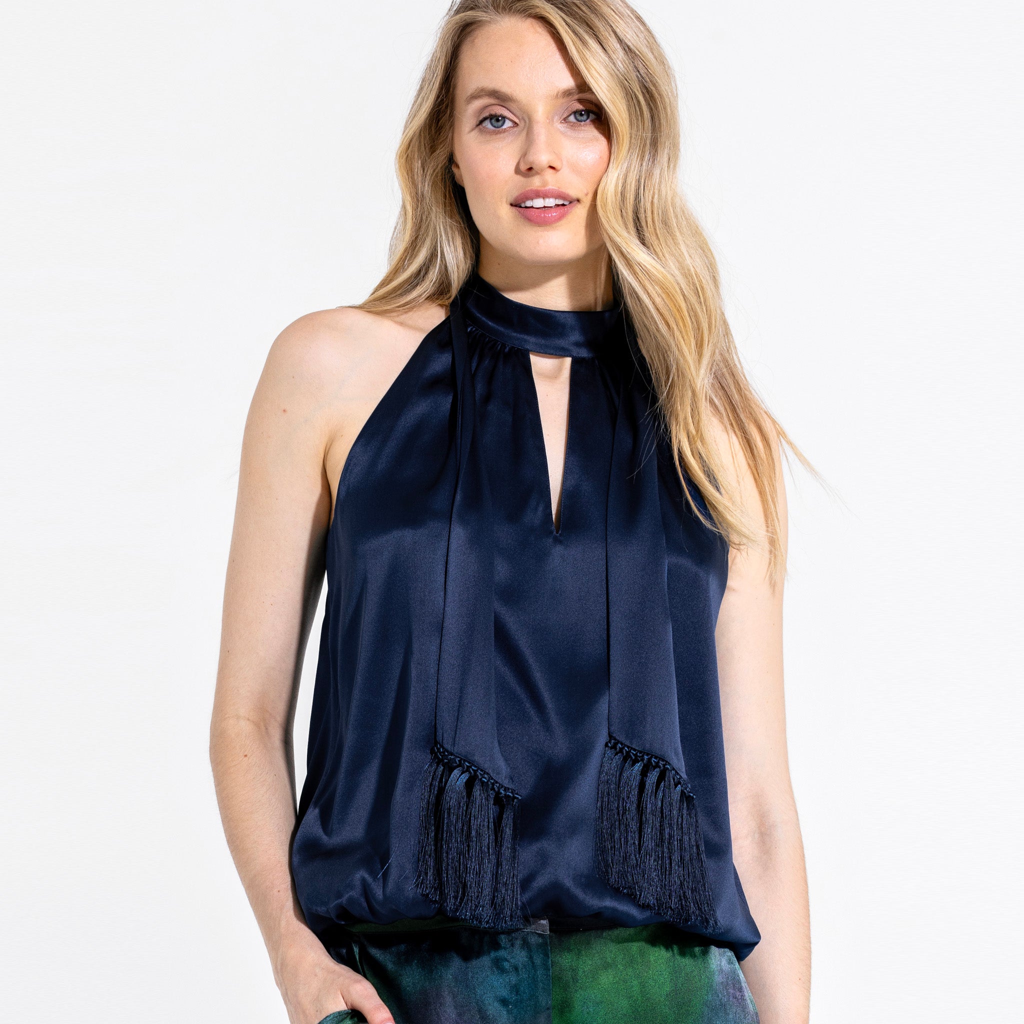 There a whole lotta statement in this one little top...paired with a classic trouser or skirt or even your favorite jean, and the detail-driven top makes the outfit. We made the fringe-trimmed back neck tie just long enough to give you the freedom to play around with different ways of styling.