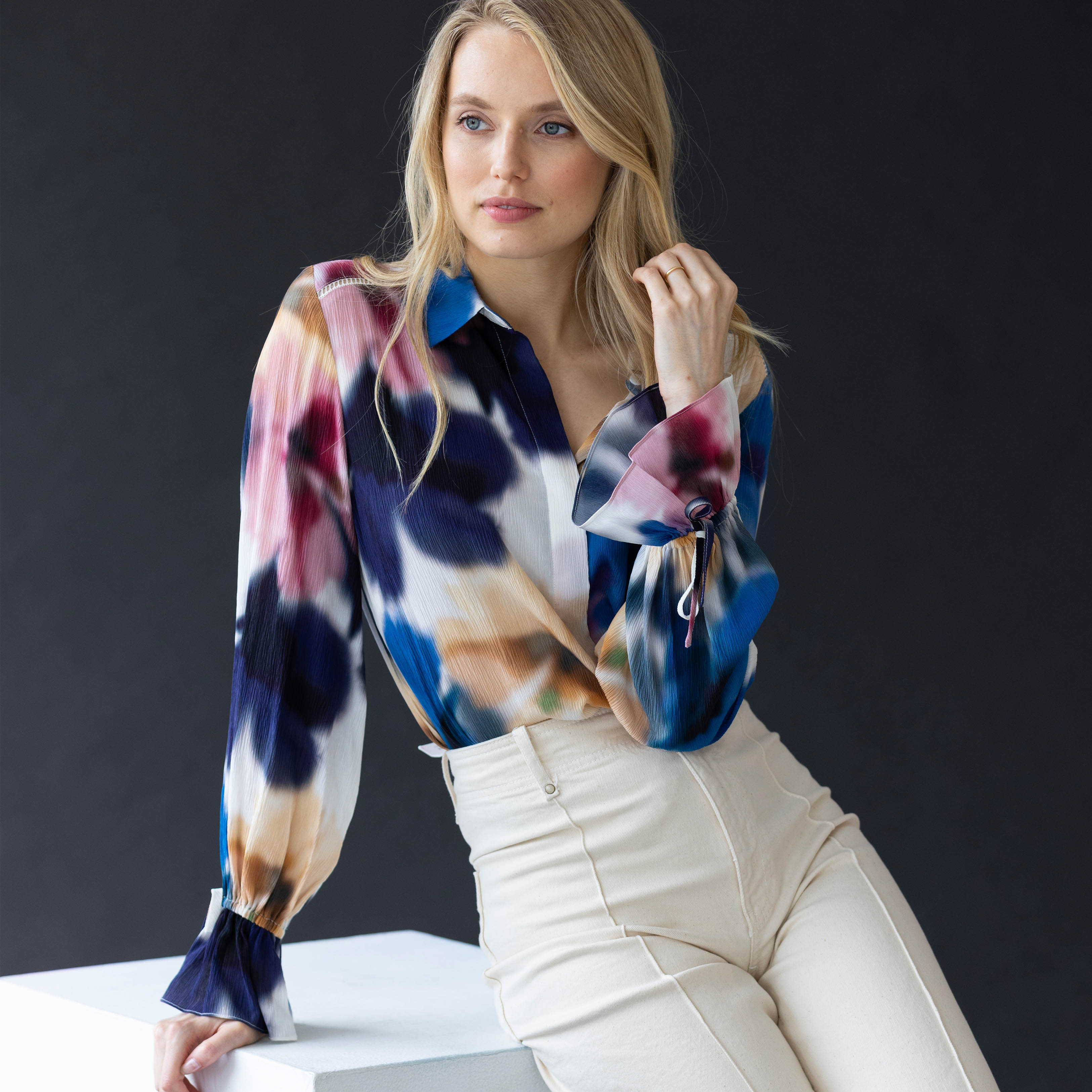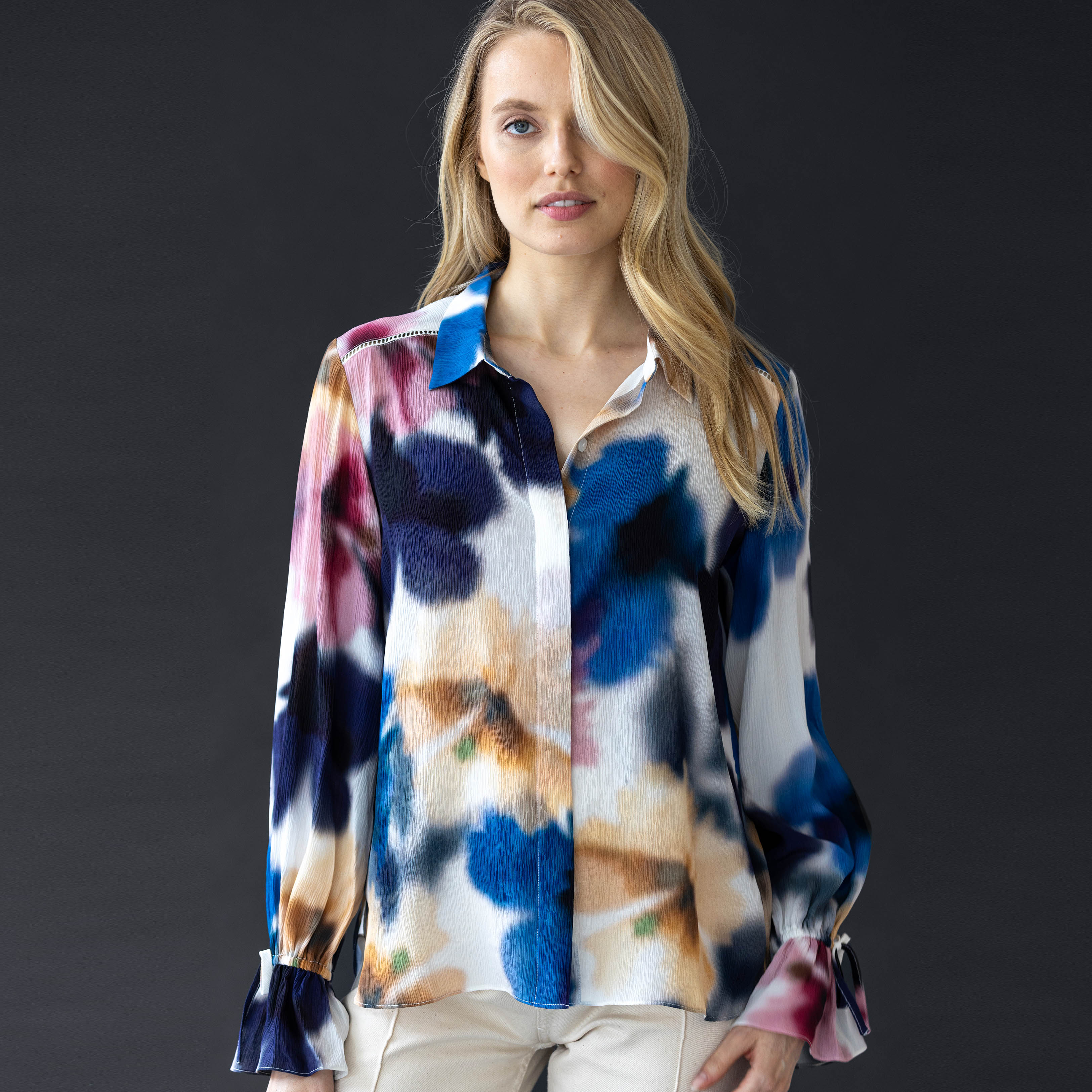 The classic silk button down blouse, but with a dash of romance. Crafted from our signature crinkle silk, this blouse features subtle blouson sleeves and a ruffle cuff accents that adds a dose of drama. We love that the versatile length of the blouse, making it as easy to tuck, half-tuck, untuck, or wear open over a tank. Relaxed, cool, and very put together.