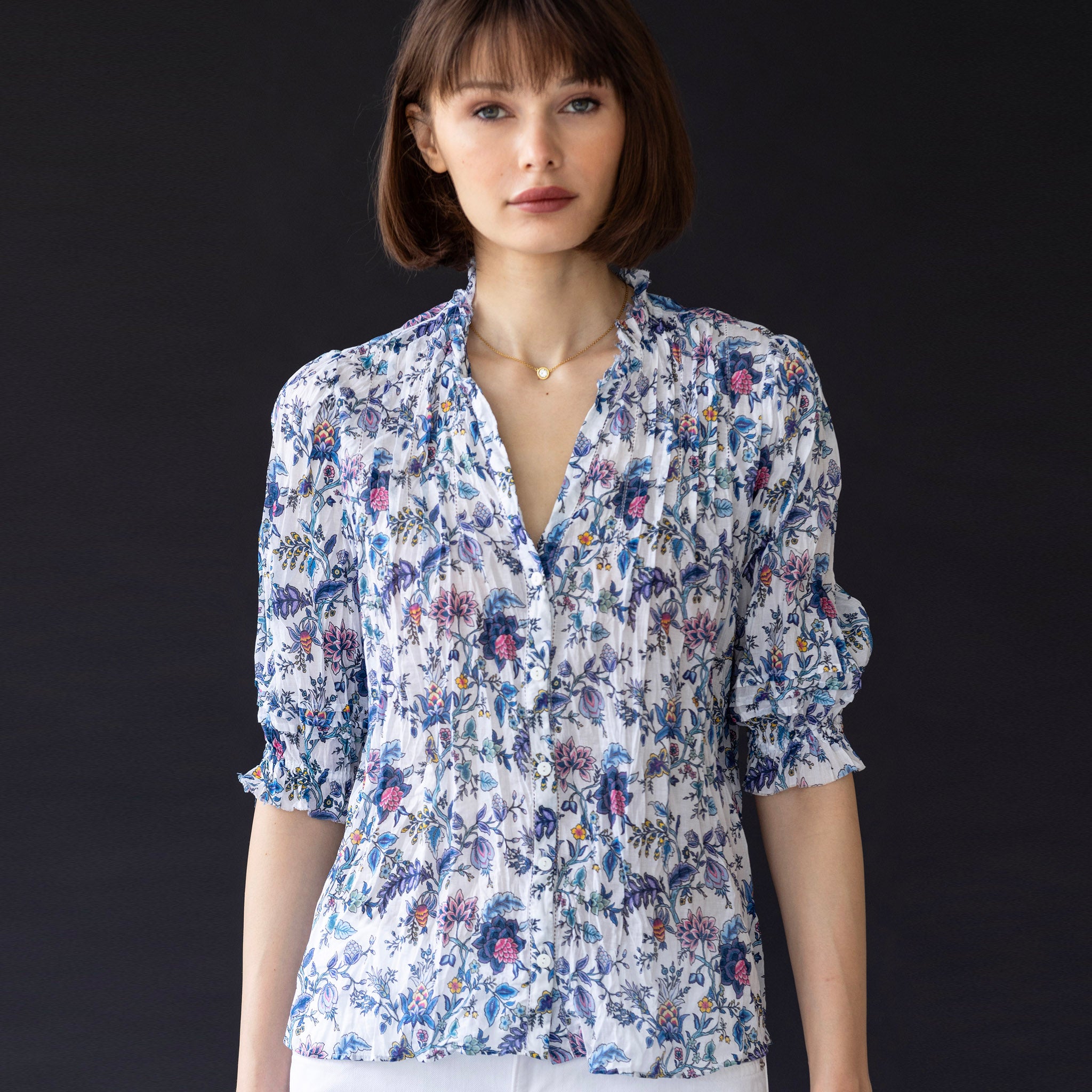 A years-long customer favorite in silk, now available in breezy pure cotton voile. We've loaded the cotton version with all the same much-adored details: delicate pleats, picot stitching, billowy sleeves, and signature raw edge finishes. A pretty, yet no-fuss style, finished off with a light hand-crinkle effect to give it the perfect laid-back vibe you crave.