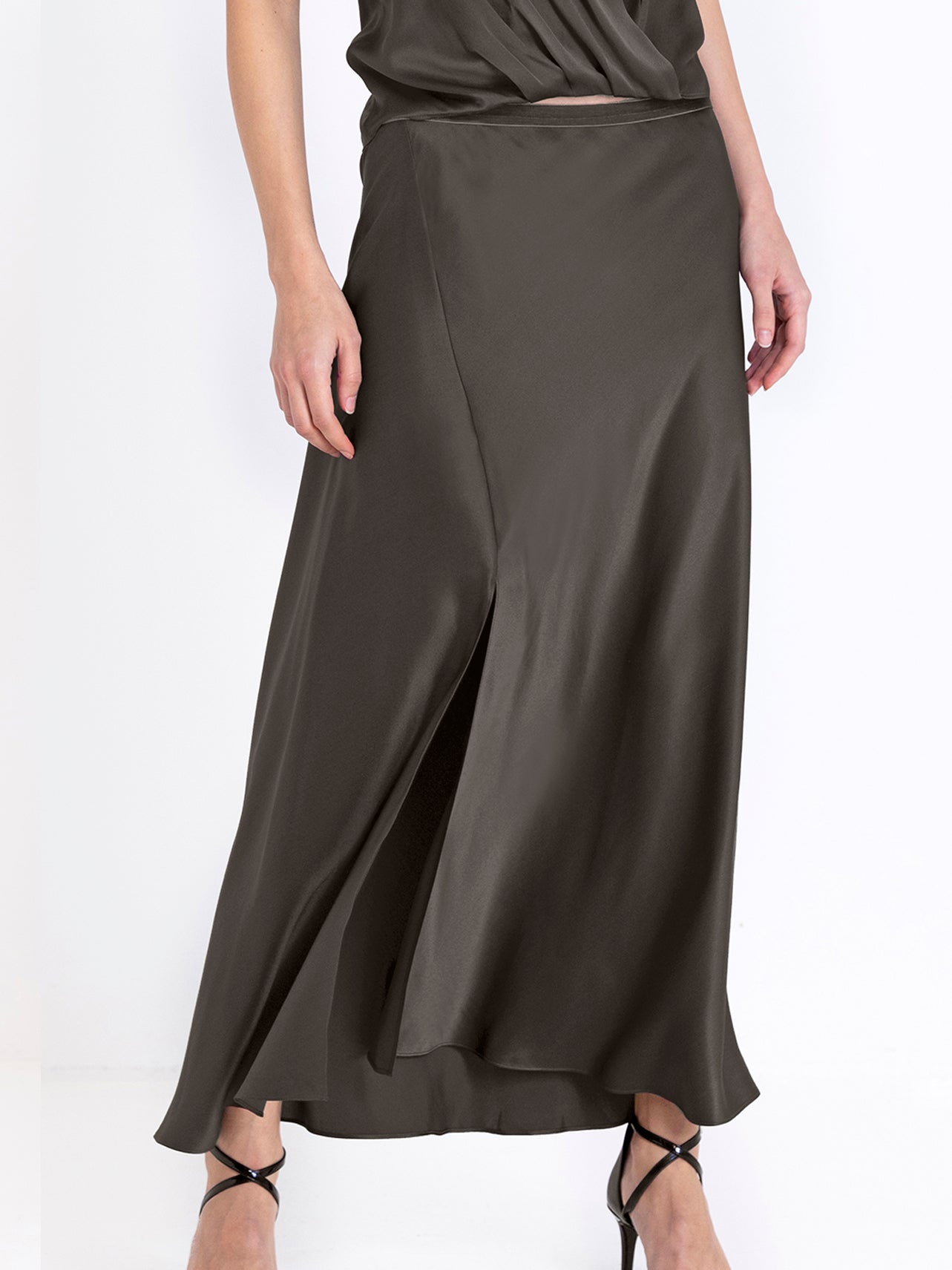A new twist on the classic slip skirt. We've added a little swing to the conventional silhouette with a flared hemline and an asymmetrical front slit. This is the kind of skirt you own in multiple colors and wear on-repeat for seasons to come.